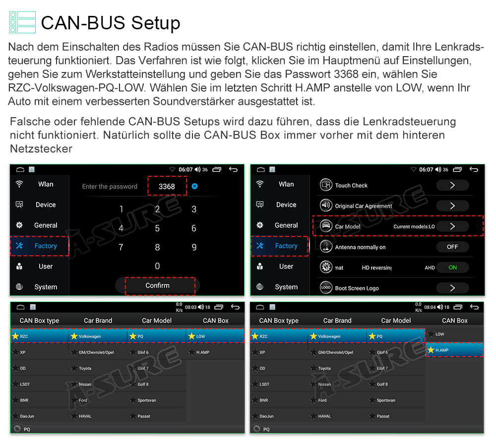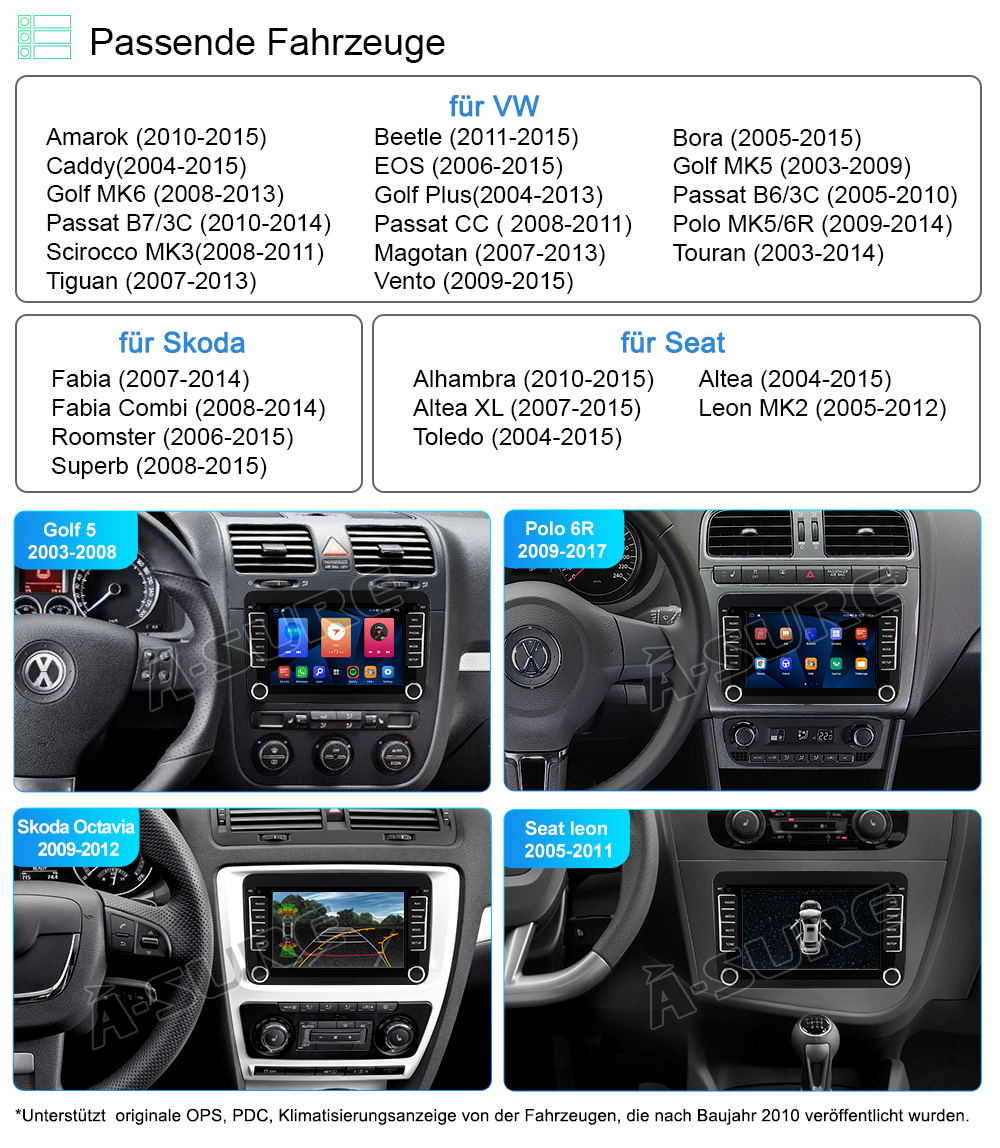 7" Android 2+32GB Wireless Carplay Android Auto Autoradio für VW Golf 5 6 V VI Passat Polo Touran Tiguan Sharan Caddy Jetta Unterstützt DSP Bluetooth SWC USB GPS Navigation 7" Android 2+32GB Wireless Carplay Android Auto Autoradio für VW Golf 5 6 V VI Passat Polo Touran Tiguan Sharan Caddy Jetta Unterstützt DSP Bluetooth SWC USB GPS Navigation A-Sure Compatibility This item fits with these vehicles:   Canbus Setting:     Specialfication Video