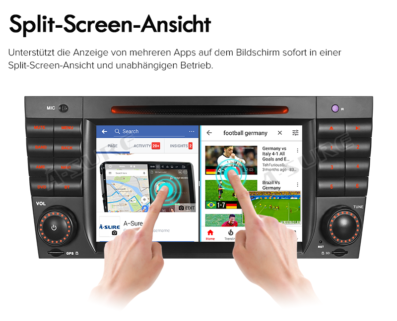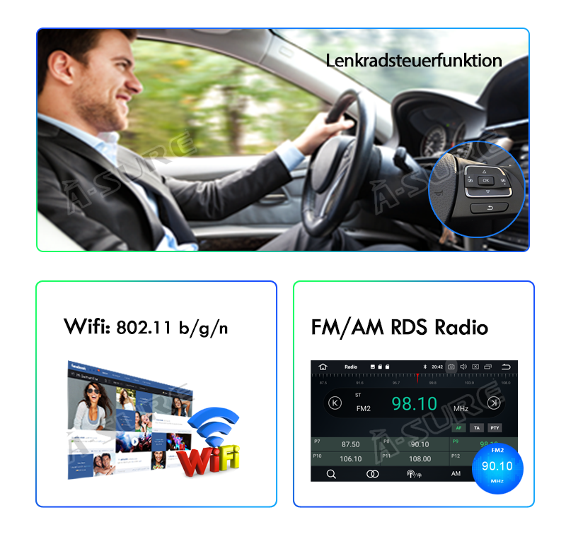 Wir sind ein professionelles In-Car-Radio und GPS-Navigation Hersteller mit 11 Jahren Erfahrungen. Mit den Lagers in UK, Deutschland, US und Australien können wir die Artikel schnell an Sie liefern(normalerweise Versand binnen 1 Werktag), Sie brauchen nicht für Importabgaben zu bezahlen. Über unsere Rückgabe bieten wir Ihnen reibungslosen Service, Sie können die Artikel, die Sie A-Sure gekauft haben, an unser Lager in Deutschalnd zurücksenden, einfach und effizient. Genießen Sie einfach den Artikel und unseren professionellen Service.